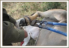 Removal of a snare and treatment of a snared buffalo in Lake Nakuru NP.