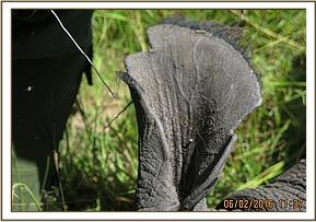 This young bull, in the company of an older bull, was seen near the research station limping on his left hind leg. After drinking water in a nearby stream, he spent time under a shady tree. He moved with a lot of difficulty and there was evidence of pain on the affected limb. No wound could be seen from a distance but there was evidence of pain when he attempted to move.