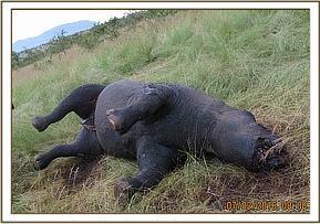 - Both horns had been removed by crude hacking and cranial part of his lower jaw hacked off.