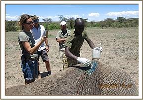 The baby elephant was capturedby use of 1mg Etorphine hydrochloride delivered in a 1.5ml Dan- Inject dart from a vehicle. It took ten minutes for the drugs to take full effect. The mother was pushed aside to allow for her examination whichrevealed a tight snare round her trunk that had cut deep and partially exposed the nares. The snare was more proximal on the trunk, a point at which if amputated would leave a small stump about a third of its total length. The elephant was breathing through the damaged part but the distal part of the trunk was still viable.