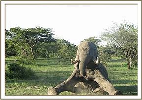 This elephant, in a herd of several other elephants, was seen limping by the Olarro Conservancy Management. He had been treated late last year for multiple spear injuries, one deep wound to his right rump accessing the hip joint and another one to the right elbow joint. He immediately disappeared from the Conservancy for some months after improving .They called the unit for assessment. The Vet Unit found him browsing alone in a thicket away from the rest of the herd. His body condition was good except for the limp of his right fore leg. A decision to immobilise him for further examination was arrived at.