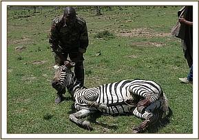 Restraint was achieved chemically by use of a combination of 6mgs Etorphine hydrochloride and 50mgs Azaperone delivered through a 1.5ml Dan-Inject dart. The zebra was darted from a vehicle, after which it ran for a few minutes before being overwhelmed by the drugs and assumed sternal recumbency. He was made to lie in an appropriate position for de-snaring.