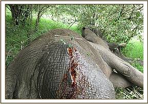 Examination revealed a severely wasted bull with poor body score. There was a penetrating wound to the right temporal side that exited on the right side with sepsis. There was another deep penetrating wound to his forehead which appeared to have been caused by a projectile. This elephant was in severe pain with grave prognosis. Euthanasia was considered but he succumbed whilst the team was still deliberating.