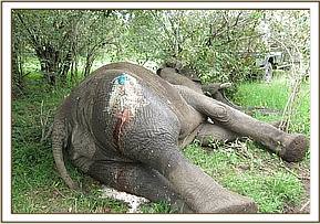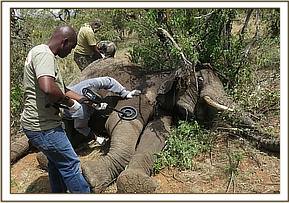 Restraint was achieved by use of 16mgs Etorphine hydrochloride delivered through a 3ml Dan-Inject dart from a vehicle. It took ten minutes for the drugs to take full effect with the elephant assuming left lateral recumbency.