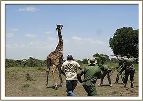 Reversal of the anaesthetic was achieved by intravenous administration of 18mgs Diprenorphine hydrochloride through the jugular vein. He woke up two minutes after reversal and joined the rest of the herd.
