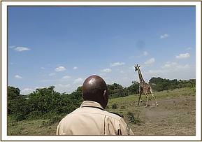 This big bull was seen injured by Naibor lodge guides together with the Masai Mara Reserve rangers on the morning of this date. They called the Vet Unit for help. This bull was found browsing alone in a small thicket with the upper portion of his rear right limb injured and swollen. He walked with difficulty.