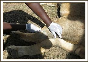 Cloxacillin ointment was infused and topical spray of Oxytetracycline then applied. Other treatments include parenteral administration of long acting Amoxicillin antibiotic and Flunixin meglumine anti-inflammatory. He was released after treatment and woke up comfortably to join the rest of the herd.