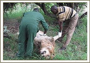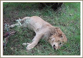 Postmortem of a male lion in Olchoro Oiroua Conservancy The adult male lion was found dead in Olchoro-oiroua conservancy, it was in a good body condition by the time it died. It had scars of previous traumatic injuries on the abdomen and hind quarters. On postmortem examination the only significant finding was the impaction of large intestines particularly the rectum with compacted soil and pebbles, the stomach and small intestines were completely empty with no ingesta, enlarged gall bladder and jaundice of the stomach membranes caused by leakages of bile contents. The lion was suspected to have died of intestinal impaction leading to abdominal pains and shock.
