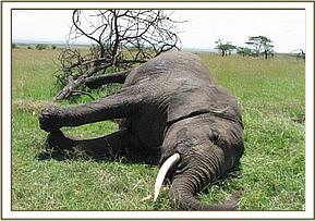 Postmortem examination of a female elephant in Mara North Conservancy This was an adult female elephant that was found dead in Mara North Conservancy, the carcass was still fresh when spotted by the conservancy scouts. It was suspected to have died of anthrax but after obtaining peripheral blood smears and observing under a light microscope, no Bacillus anthracis organisms were detected. It was also scanned by a metal detector but no bullet or any other metallic object was found. The exact cause of death was not immediately ascertained but it was suspected to have died of a traumatic injury. The tusks were still intact and were recovered and taken to KWS stores in Ewaso Ngiro.