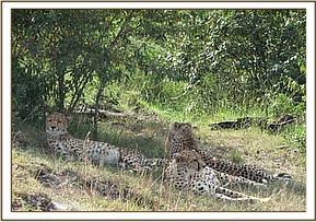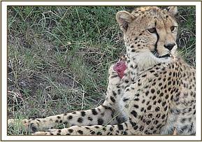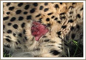 Treatment of an injured cheetah (Acinonyx jubatus) in Oloolaimutiak, Masai Mara NR This was a sub-adult female cheetah which had a large traumatic wound on the left shoulder, it was in a company of three other cheetahs, it was weak and in a painful condition preferring to lie under three most of the time and unable to hunt for prey. It required urgent veterinary attention before the wound progressed further to cause septiceamia. The cheetah was spotted by the Narok county council rangers based at Oloolaimutiak gate, it was then restrained by chemical anaesthesia and treated successfully. Chemical restrain The cheetah was darted from a close distance using 150mgs of ketamine combined with 1.5mgs of medetomidine hydrochloride on the left thigh; it took about 10 minutes for the drug to take effect. After being anaesthetized, it was transferred to a cool shade under a tree from where it was examined and treated. Both the eyes were covered with opticlox eye ointment to avoid desiccation and conjunctivitis while it was recumbent. The dart was removed and dart wound treated using Opticlox eye ointment. The vital physiological parameters were monitored and recorded to ensure that it was under stable anaesthesia. Clinical examination It had a large infected wound on the proximal part of the right shoulder next to the humero-scapular joint (shoulder joint). The wound was very painful, itchy and seemed to have stayed for over a week without healing as was expected. It was suspected to have been bitten by a lion as they struggled over a prey. Treatment The wound was properly debrided and cleaned using clean water and then 10% hydrogen peroxide; and topically treated using a tincture of iodine applied on it and then sprayed by oxytetracycline spray. The wound was already infected and could not be sutured. The animal was further treated using antibiotics (Amoxycillin) Betamox and dexamethasone administered intramuscularly to counter inflammatory reactions and to reduce pain.