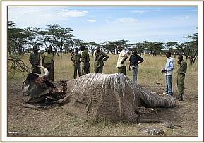 Postmortem examination of a bull elephant in Olmotorogi Conservancy The carcass of the bull elephant was sighted in Olmotorogi Conservancy after a bout 1 week, the carcass had been preyed on by vultures and hyenas leaving only skin and bones which could not reveal much about the cause of death. Bothe tusks were still intact and were recovered to KWS store in Ewaso Ngiro. A metal detector was used to scan the carcass to try to detect any metallic object or bullet which could have been used to kill the elephant, but nothing was found.