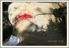 The wound and surrounding area was sprayed with Oxytetracycline before 4500mgs Amoxicillin antibiotic and 40mgs Dexamethasone Sodium anti-inflammatory were administered intramuscularly.