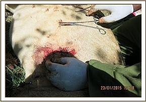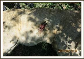 Examination revealed a deep sharp edged penetrating wound measuring seven inches wide and deep enough to access the pleural cavity between two ribs. The wound was most likely caused by spearing. The lion was breathing with difficulty and some air was escaping from the pleural cavity through the wound opening causing rapid, shallow breathing. A big blood clot was found on the edge of the wound margin and more blood clots were suspected to be within the pleural cavity. This, combined with the leakage of air through the wound could have led to limited lung movement and the rapid shallow breathing. Treatment was done quickly in order to stabilize the animal and prevent further deterioration.