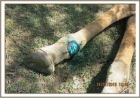 Immobilization was done by use of 13mgs Etorphine Hydrochloride delivered remotely through a 3ml Dan Inject dart. Darting was done from vehicle. It took eight minutes for the drugs to take full effect with this elephant assuming sternal recumbence. Once he was down, the mother would not initially let us approach him, but with help of more than two vehicles, she was eventually convinced to give the Vet Unit access to her calf. After making sure the elephant was stable, quick examination of the affected limb revealed an old snare wound at the heel. The snare had since fallen off leaving a raw wound, which appeared relatively clean. A sterile gauze soaked in dilute Hydrogen Peroxide was used to swab the wound to remove necrotic debris. Clean water was then used to rinse the wound before tincture of Iodine being applied as disinfectant. Oxytetracycline wound spray was then used topically before a coat of green clay being applied to promote healing.