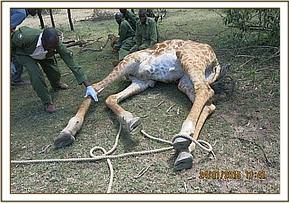 This giraffe was immobilized using a combination of 11mgs Etorphine Hydrochloride and 50mgs Azaperone in a 3ml dart. Darting was done from a vehicle. The drugs took effect after eight minutes and the giraffe was pulled down and restrained with the help of ropes.
