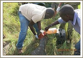 The calf was immobilized using 3.5mg Etorphine Hydrochloride delivered through a 3ml Dan Inject dart shot from a vehicle. The drugs took 8 minutes to take effect. His mother refused to abandon her calf and she stayed close until after he was overwhelmed by the anaesthetics at which point attempts were made to scare her away using vehicles. She resisted for a while, but eventually resigned herself and moved away to watch the action from a safe distance.