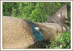 The wound was disinfected using tincture of Iodine before Oxytetracycline spray was applied. Green clay was packed into the wound to promote healing. Lastly the elephant calf received intramuscular injection of 3000mgs Amoxicillin antibiotic and 30mgs Dexamethasone Sodium anti-inflammatory.