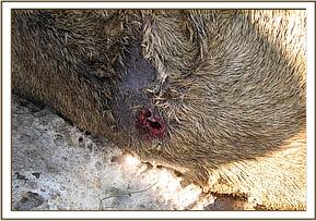 Examination and treatment The lion was examined and found to be under stable anaesthesia then the arrow-head was removed carefully using tissue forceps, surgical blade and haemostats. It had created a deep wound through the vertebral column at the spines of lumbar vertebrae region. The impact of the arrow had caused some cracks on the vertebral disc where we extracted some pieces of bone flakes. The wound was already infected and could not be sutured due to sepsis, it was therefore cleaned and debrided using 10% hydrogen peroxide followed by application of tincture of iodine and cloxacillin ointment. It was further treated by Betamox antibiotic and dexamethasone administered intramuscularly. Blood and tissue samples were collected for laboratory analysis and future reference.