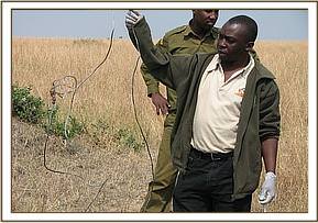 Removal of a snare from a Giraffe in Mara Triangle This was an adult male giraffe that had been sighted with a loose wire snare hanging around the neck, it had not inflicted any injury to the neck but it was quite long and the giraffe was pulling it on the ground and affecting its movements in the wild. The animal was sighted by the Mara Conservancy rangers while on their regular patrol and reported the case to Mara veterinary unit for attention.