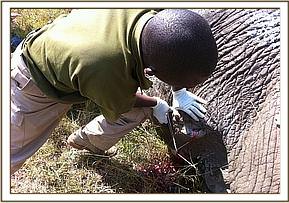 Chemical immobilization, examination and treatment The elephant was darted from a vehicle using 15mgs of etorphine Hcl combined with 3000 i.u on the left thigh. The drug took effect after about 6 minutes and it became recumbent. The wound was then examined for the presence of any foreign material but there was none, two slit openings were created on the ventral side of the abdomen and pus and necrotic debris drained out completely, this relieved the elephant from abdominal pressure resulting from the fluid and pus accumulation. Then wound was then cleaned with a lot of water and gauze swabs removing all the mud, maggots and loose tissue debris. It was also probed using long tissue forceps in an attempt to find out how deep it penetrated into the tissues.