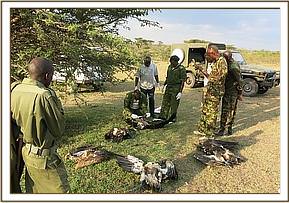 Narok county government security team called to report this incident. They requested our services to try and determine the cause of death for these vultures. Five vultures had died within a radius of fifty meters from each other. Within their proximity was an old dismembered carcass suspected to have been of a Tomy gazelle. The carcasses appeared to have been between 72 to 96 hours old.