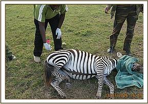 Restraint was achieved chemically by use of a combination of 6mgs Etorphine hydrochloride and 50mgs Azaperone in a 1.5ml dan-inject dart fired from a vehicle. It took eight minutes for the drugs to take full effect with the zebra going down on her left lateral side. A plain wire snare round her neck was removed. It was not very tight but had created an abrasion wound round the neck. The wounds were disinfected with Iodine and Oxytetracycline spray applied. In addition, she received 3000mgs Amoxicillin antibiotic parenterally.