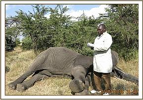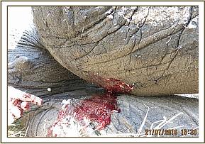 Immobilization was achieved by use of 15mgs Etorphine hydrochloride delivered in a 1.5ml Dan inject dart from foot because of the thicket. It took eight minutes for the drugs to take full effect with this elephant assuming left lateral recumbency. Examination revealed a penetrating wound to the inner side of her right front limb near the elbow. The wound was septic with purulent discharge and most likely caused by an arrow which had since fallen.