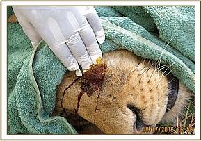 Examination revealed a deep bite wound on the lumbar section of his spine. Luckily the spinal cord was not affected. The wound was beginning to get septic and was most likely caused by conflicts with other lions. The wound was debrided with dilute Hydrogen peroxide, wiped clean with a swab and rinsed with clean water before tincture of iodine being applied.