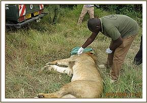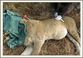 Immobilization was achieved by use of a combination of 4mgs Medetomidine and 220mgs Ketamine hydrochloride in a 3ml dan-inject dart from a vehicle. It took 15 minutes for the drugs to take full effect with the lion assuming right lateral recumbency.
