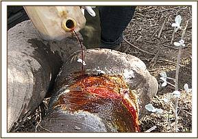 This was a case of an adult male elephant which had an abscess and a wound on the dorsal side of the right front leg penetrating straight into the tarsal joint. The wound was already infected and the entire leg was extremely swollen almost double the size of a normal leg. The injury was quite painful and the bull elephant remained on one spot for several hours without much movement. It was suspected to have been stabbed by a poisoned arrow head that led to extensive myositis, oedema and severe inflammation of the entire leg. Chemical immobilization, examination and treatment The elephant was darted on foot using 18mgs of etorphine Hcl and 1500 i.u hyaluronidase; the drug took effect after about 10 minutes when it went down on the lateral side. The wound was probed carefully using a long forceps and was found to have penetrated up to about 4 inches deep into the joint. A lot of pus and necrotic tissue debris were drained from the wound in an attempt to reduce the swelling and enhance chances of healing, the injury extended into the bones of the joint and the animal had a very high risk of developing arthritis. After examination, it was realized that there was no foreign material in the affected area, the wound was then cleaned and treated using a tincture of iodine and oxytetracycline spray. Further treatments using long-acting oxytetracycline antibiotics, multivitamins and dexamethasone were provided. Revival of anaesthesia and prognosis After treatment the elephant was immediately revived from anaesthesia using 60mgs of diprenorphine hydrochloride administered through the ear-vein. It had a poor prognosis due to the effect of the poisoned arrow that caused the injury. The rangers were advised to keep monitoring it daily and report the progress just incase the elephant requires further attention.