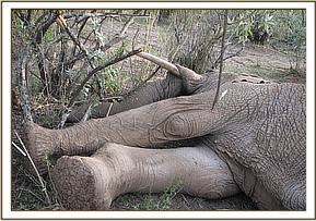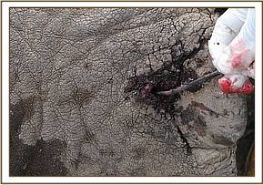 This was a case of a sub-adult male elephant which had two deep wounds on the tarsal joint of the right front leg, just above the spool. The wound was already infected with a lot of pus, fluid and necrotic tissue debris accumulation; the elephant barely walk and it was left behind by the rest of the herd since it could not keep pace with the rest of the elephants, it was avoiding much weight on the affected leg. From one of the wounds we extracted an arrow head that was still stuck deep into the wound. The elephant was sighted in a dense bush-land by the community scouts from Narosura group ranch. Chemical immobilization, examination and treatment The elephant was in a very dense bush-land where it could not be easily located; it took us along time of traversing the bushy area on foot trying to locate the elephant for darting. It was then darted using 16mgs of etorphine Hcl and 1000 i.u hyaluronidase, the drug took effect after about 5 minutes and it became recumbent. The two wounds were cleaned with a lot of water and gauze swabs removing all the mud, necrotic tissue debris and pus from the infected site, and then the wound was probed carefully using a long forceps to find out if there was a foreign material inside and how deep it penetrated into the tissues. In the process of probing an arrow head of about 6 inches was extracted from the wound. The wound was further cleaned using 10% hydrogen peroxide then treated with a tincture of iodine and oxytetracycline spray. Further treatments by intramuscular administration of long-acting oxytetracycline antibiotics, multivitamins were provided. Blood and hair samples were collected for testing of various infections such as bovine tuberculosis. Revival of anaesthesia and prognosis The elephant was revived from anaesthesia using 48mgs of diprenorphine hydrochloride administered through the superficial ear-vein. The elephant had a good prognosis after the removal of the arrow head from the wound and treatment. The animal was still very active with good appetite and in good body condition by the time of treatment; this will greatly improve its chances of survival.