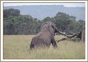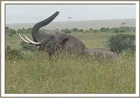 Treatment of a wounded male elephant in Masai Mara. This was a case of an adult male elephant which had a severe extensive wound on the lateral side of the right front leg. The wound was quite infected with a lot of necrotic debris, the cause of the injury was not known but it was suspected that the animal had been shot by poisonous arrows which caused an acute inflammation and cellulitis that led to these extensive wounds on the leg. This was one of the elephants that was fitted with a GPS collar in December by KWS and Save the Elephants (STE) team as a means of addressing human-elephant conflict in Masai Mara ecosystem. It was sighted by the Masai Mara rangers together with the Mara North Conservancy rangers who immediately informed the vet to attend to it. It was under a great pain and moved with a lot of difficulties. It also had the risk of developing septiceamia. Chemical immobilization, examination and treatment The elephant was darted from a vehicle using 18mgs of etorphine Hcl combined with 1500 i.u, the drug took effect after about 6 minutes and it became recumbent. The wounds was then examined for the presence of any foreign material, then cleaned with a lot of water and gauze swabs removing all the mud, maggots and loose tissue debris. The wound was also probed using long tissue forceps in an attempt to find out how deep it penetrated into the tissues. There was no arrow-head or any foreign material retrieved from the wound. It was then cleaned and debrided using 10% hydrogen peroxide draining all the accumulated pus and tissue debris, then treated using a topical application of a tincture of iodine and oxytetracycline spray. It was also covered with green clay powder which maintains wound cleanliness, repel flies and enhance pus drainage.