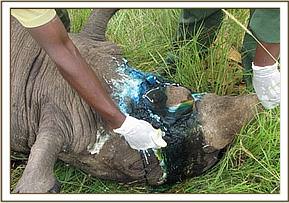 Treatment of a male black rhino in Masai Mara National Reserve This was a case of an adult male black rhino that was sighted with serious traumatic injuries around the caudal horn and face. It had been engaged in a fierce fight with another male within Musiara area of Masai Mara National Reserve. The wound had lasted about 24 hours and was full of blood clot. The rhino was sighted by the Mara rhino monitoring team who reported immediately to KWS vet for action to be taken. Chemical immobilization and treatment After making extensive search by foot patrol, the injured rhino was located in a densely vegetated area a few kilometers from Main Governors camp. The animal was then darted on foot since the area was stony and marshy such that vehicles could not reach where the rhino was. It was darted using 4.5mgs of etorphine hydrochloride combined with 80mgs of xylazine hydrochloride. It took about 5 minutes for the drug to take effect and the animal went down on lateral recumbency, then 10mgs of Narlophine hydrochloride was administered through the ear vein to help improve the respiratory rate which was recorded at 8 cycles per minute while the body temperature was 39.0 oC. Examination and treatment The animal had injuries around the caudal horn (short horn), the horn was still intact except for injuries around it. The wounds were flushed with hydrogen peroxide 10% and then treated using a tincture of iodine then sprayed with oxytetracycline spray and green clay. The rhino was also treated with long acting Betamox (antibiotic) injection, multivitamins and dexamethasone.