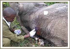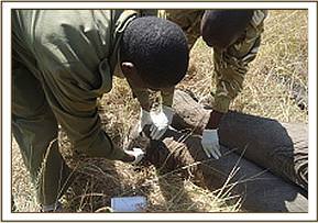 Case #7 Date: 24th June2013 Species: Elephant Age: Sub adult Sex: Male History Mara bush tops scouts reported having seen this elephant for the last two days ambulating with difficulty. General examination The elephant appeared to be in pain while ambulating.The left front limb was the problem. Nevertheless the elephant was feeding. Immobilization and treatment A combination of 15mgs etorphine hydrochloride and 1000international units of hyalouronidase was used through Daninject system. The elephant was tranquilised after 9minutes. Examination revealed a swollen left front limb at the level of carpus with a small discharging wound laterally. This was a case of septic arthritis as a result of injury. The wound was washed with hydrogen peroxide and corpious amount of water. Lugols iodine was then applied together with oxytetracycline wound spray. It was then given 15000mgs of Amoxycillin antibiotic intramuscularly. Reversal 48mgs diprenorphine hydrochroride was administered through ear vein and the elephant got up in two minutes. Prognosis Fair