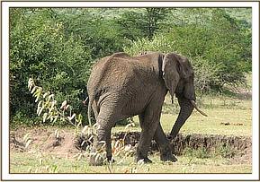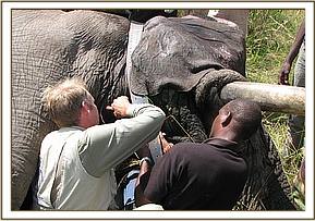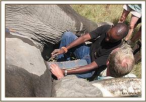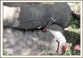 Animal: African Elephant (Savannah elephant) Species: Loxodonta Africana africana Sex: Male Age: Adult Location: Elephant pepper area, Mara North Conservancy GPS: S011258.4 E0350828.5 Date of Clinical intervention: 6th June 2013 Clinical History An adult male elephant seen walking with difficulty, suspected to be injured. Immobilization Etorphine Hcl 18mg, in a 3 ml Dan - inject dart was prepared. Using a Dan inject dart rifle the elephant was darted, it was immobilized after 10 minutes. Examination and Wounds management An arrow head had lodged at the right front leg close to foot. The offending arrow head was about 6cm long, lodged deep into tissues of the foot. The penetrating wound was also discharging pus. The wound were cleaned with copious amounts of water and dead tissues removed. The suppurative wound was lavaged with surgical spirit and later liberally cleaned with dilute lugols iodine. The elephant was injected with the following, i. Oxytetracycline 30,000mg (Alamycin 30% LA) i.m ii. Flunixin meglumine 1,000mg i.m