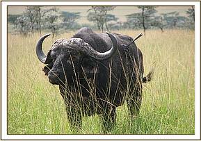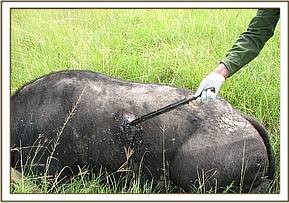 Case # 3 Animal: Savannah buffalo Species: Syncerus c. caffer Sex: Male Age: adult bull Location: Masai Mara, Olare Orok Conservancy at Rhones airstrip area Date of intervention: 15th June 2013 History A buffalo bull had been spotted speared on the back and the spear handle attached to the spear head. The spear had been thrust deep into the body of the buffalo and had failed to fall off. We had searched for the buffalo for a whole day on 14/6/2013. Immobilization Etorphine Hcl 8mg plus xylazine Hcl 25mg combination, in a 1.5 ml Dan - inject dart was prepared. Using a Dan inject dart rifle the bull was darted, it was immobilized after 10 minutes. Examination and Wounds management A spear head lodged at the 7th rib causing a fracture of the same and penetrating deep into viscera including the rumen, diaphragm and partly plural cavity. The part offending spear head which had penetrated into tissues was 50cm long. The penetrating wound was discharging pus and was ridden with maggots. The wound were cleaned with copious amounts of water and dead tissues removed. The suppurative wound was lavaged with dilute hydrogen peroxide and later liberally cleaned with dilute lugols iodine. The bufallo was injected with the following, i. Amoxicllin Trihydrate 15,000mg (Betamox LA) i.m ii. Flunixin meglumine 1,000mg i.m Oxytetracycline spray was applied as a fly repellant Animal care during anesthesia Animal was doused with plenty of water