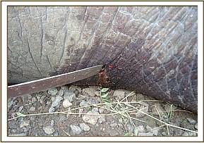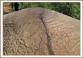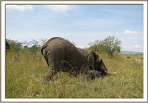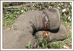 Case #5 Date: 17th June 2013 Species: Elephant Sex: Male Age: Adult History The Siana conservancy management reported having sighted an elephant with suspected injury around the withers. The elephant was seen to be in poor body condition and with limited movements. General examination The elephant was seen to be in poor body condition though feeding, it appeared dull and lethargic. Immobilization The elephant was immobilized using 15mg Etorphine Hcl and 1500 IU Hyaluronidase delivered through Daninject system. The drugs took effect after 8 min. Physical examination The elephant appeared to be in poor body condition with bony prominences discernible.A small ulcerating papilloma with maggot infestation was seen on the left side of the withers. The skin around the right rump appeared cracked and ulcerated. The cause of debility was not immediately ascertained but suspected to be long standing septicaemia. Treatment Maggots were duly removed and the both wounds cleaned with water and hydrogen peroxide. Lugols iodine was applied together with oxytetracycline wound spray. 15000mgs Amoxycillin antibiotic injection was given intramuscularly.100mgs of Dexamethasone sodium antiinflamatory was also given intramuscularly.The management was advised to keep monitoring the progress and if need be, repeat treatment can be instituted after two weeks. Reversal 48mgs of diprenorphine hydrochloride was administered intravenously through ear vein and the elephant woke up without difficulty after two minutes. Prognosis Guarded