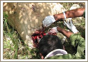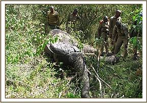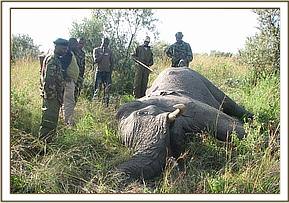 Case #8 Date: 25th June 2013 Species: Elephant Age: Adult Sex: Male Location: Gps-36m 0757836, UTM 9826952. History The elephant was reported dead by the Narok County Council security patrol team behind Ngama hills. General examination The elephant was in good body condition and both tusks were intact Had a spear sticking out on the left flank with serosanguineous discharge. There was evidence of struggle at the scene before death. The carcass was fresh with no rigor mortis Post mortem examination On opening the carcass, the following were noted: 1. The spear had fractured the last rib midway 2. The spear wound was about 5inches wide and 15inches deep 3. Damage to abdominal vital organs was significant, this involved injury to: large intestines, liver and right kidney. This was spear-inflicted. Conclusion Damage to vital organs could have compromised physiological functions hence survival of this elephant. Both tusks were recovered and handed over to Narok County Council security team for safe custody. There is circumstantial evidence to show that humans were involved in the death of this elephant.