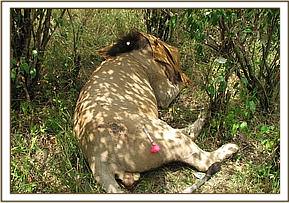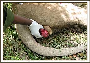 Case # 4 Animal: Lion Species: Panthera Leo Sex: Male Age: adult Location: Masai Mara, National Reserve at Tipili kwani Talek area Date of intervention: 16th June 2013 History An injured lion during a fight for a mating partner during mating period was reported on 16th June 2013. Examination One testicle had been opened; scrotal skin and testicular tunics had been lost. The wound was 5 days old and the remaining parts of scrota had contracted and adhesions had formed and the testicle was fully exposed. Immobilization Ketamine Hcl 300mg plus 10mgof Medetomidine combination in a 3ml Dan - inject dart was prepared. Using a Dan inject dart rifle the lion was darted, it was immobilized after 10 minutes. Examination and Wounds management Surgical removal of the injured testicle (castration) was carried out. Ligations of the arterial and venous blood supply to the testicle using hemostats and chromic catgut # 3 (7metric) and chromic catgut # 2 sutures were carried out. Others bleeders were duly clamped and ligated. The remaining scrota were opposed using chromic catgut # 3 by simple continuous pattern. The lion was injected with the following, i. Amoxicillin Trihydrate 4,500mg (Betamox LA) i.m ii. Dexamethasone 20mg i.m Oxytetracycline spray was applied as a fly repellant Other wounds inflicted during the nasty fight were cleaned and lavaged with dilute hydrogen peroxide and an Oxytetracycline fly repellant spray applied Reversal of anaesthesia After 1hour and10 minutes of anesthesia, the effects of medetomidine were reversed. Using 20mg of atipamizole given IM the lion was reversed from anaesthesia, recovery was smooth and he ambulated well. He was later joined by his mate (lioness). Prognosis of the case Good to fair