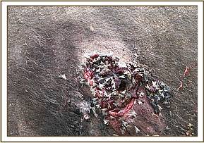 Case # 2 Animal: African Elephant (Savannah elephant) Species: Loxodonta Africana africana Sex: Male Age: Sub adult Location: Masai Mara, Olare Orok Conservancy at Hamerkop area GPS: S01319.14 E0350199.80 Date of autopsy: 8th June 2013 History This elephant was located inside a river bed dead after 2 days search. The tusks were extracted on 07/06/2013 and handed over for safe custody to KWS Security personnel through the conservancy management. General findings The elephant had a stab wound on the left flank located on the ventral abdomen cranial to the left hind leg. The stab wound (a spear wound) was 10 cm wide and had penetrated deep into abdominal cavity .A small part of omenta had eventerated externally and some serosal fluid had oozed out. Specific findings i. Stab wound on the left flank about 10cm in width ii. Fibrin and pus covering serosal surfaces of intestines and colon iii. Severe peritonitis ascending from stab wound point to viscera iv. Marked congestion, ecchymotic hemorrhages on the muscles of the abdomen v. Gangrene at point where sharp object had penetrated into intestines vi. Lungs marked congestion and inflamed vii. Liver cooked appearance Pathological diagnosis Severe purulent peritonitis due to leakage of ingesta from intestines to abdominal cavity Cause of death Severe purulent peritonitis leading to pneumonia and respiratory failure