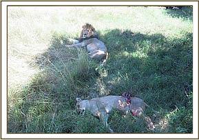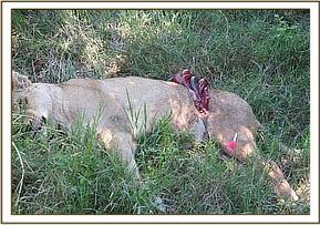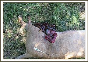 The lioness was lying down beside her male companion, unable to stand or move. Her left flank was torn open with the intestines and other abdominal viscera exteriorized. The lioness appeared to be edging into a state of shock with enlarged pupils and signs of anxiety.