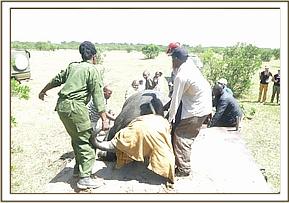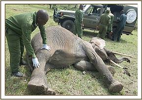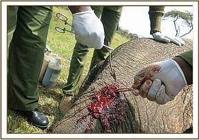 For closer examination and treatment, this elephant was darted with 15mgs Etorphine Hydrochloride by Dan inject darting system from a vehicle. The elephant moved for about 400m before the drugs took effect; approximately after eight minutes. He assumed left lateral recumbency position which gave us advantage given that the wound was on the right side. The terrain was also good.