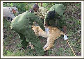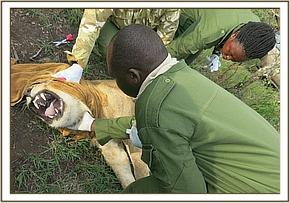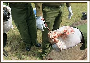 The lioness was darted with a combination of 3mgs Medetomidine and 240mgs Ketamine in a 3ml Daninject dart for closer examination. She did not move and was fully anaesthetized after 5 minutes. The male companion was chased away with the help of vehicles to allow proper assessment of the lioness. A face towel was applied to cover the eyes and immediate temperature readings taken. The temperature was 33oc which was subnormal. The wound on the left flank was extensive and deep with exteriorization of the intestines, omentum and part of the liver. Closer examination revealed perforation of small intestines with the ingesta contaminating the peritoneum. Other puncture wounds were observed on the right loin area and distally on the right forelimb. The injury could have been inflicted the night before.