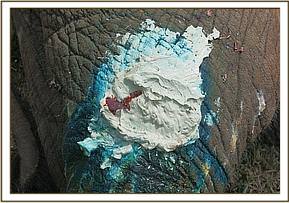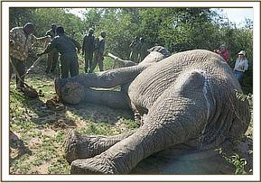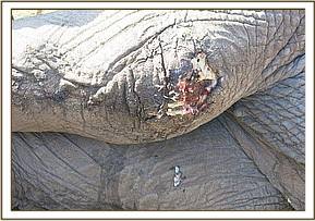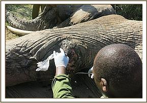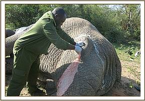 To immobilize this elephant for closer examination, 17mgs Etorphine was delivered through a 3ml Dan inject dart by use of vehicle. It took twelve minutes for this bull to get fully immobilized falling on his right side. As it was a hot day, he was doused with plenty of water to cool him and a thorough examination of the wounds was carried out. The wound on the thigh appeared to have been caused by spearing. Although no foreign body was found the wound was septic with an accumulation of pus. This wound was blind ventrally where a lot of pus accumulated. An opening was created at the most ventral partof this wound for maximum drainage of pus and for through and through lavage. About 4liters of pus was drained and a copious amount of water was used to lavage this wound. All debris was removed by probing, use of Hydrogen Peroxide and swabs. Finally, Lugols Iodine was used for irrigation before green clay was packed into the wound.