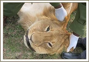 Immobilization was achieved by administration of 3mgs Medetomidine and 240mgs Ketamine in one 3mls Dan inject dart from a vehicle. After the lion was fully anaesthesized, he was placed in left lateral position and a more comfortable posture. However, the snoring became more pronounced and there was evidence he was breathing with difficulty especially through the mouth. The team tried to pull the tongue out so as to give enough space for air to flow out but the lion still had difficulties in breathing. The nostrils were also blocked by the swelling and so was the entire upper respiratory system including the larynx. The oral mucosa was extensively swollen and cyanotic. This lion died while treatment was being instituted and a post mortem immediately conducted.