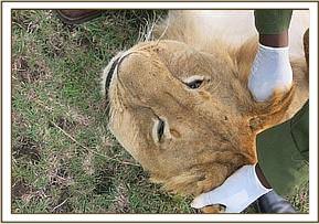 This lion was in perfect body condition. The neck upwards was severely swollen to the extent that both nostrils were substantially blocked. The head, lips and the tongue were equally swollen with severe cyanosis.