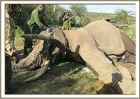 The Siana conservancy management called to seek intervention on this massive elephant bull with wounds on his left elbow and left thigh. He was in the company of two other mature bulls who were in sound health.