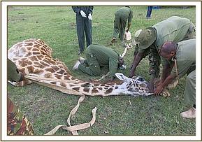 Achieved by administration of 36mgs Diprenorphine Hydrochloride given through the jugular vein, the giraffe then woke up with a little assistance after approximately ten minutes.