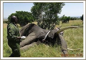 The carcass was estimated to be 3 to 4 days old with the external surface showing bite marks by scavengers as they tried to rip it open. The tusks were intact and were collected by the KWS security team for accounting and custody. The carcass was a shell as all the internal organs had been eaten by hyenas.