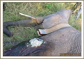Examination of the wound revealed it could have caused by an arrow shot a week prior to intervention with the wound becoming septic. Further probing did not reveal any foreign object and the arrow head was thought to have fallen out. The wound was debrided with hydrogen peroxide, wiped with gauze and tincture of iodine wasapplied. Green clay was then packed to absorb toxins and hasten healing. Replacement of the collar was going on simultaneously with a GSM/Satellite collar being deployed. This elephant received 30000mgs amoxicillin antibiotic and 4000mgs flunixin meglumine anti-inflammatory all intramuscularly. Soundness of the collar was confirmed while the elephant was still under anaesthesia and this will help in monitoring him as he is a habitual crop raider.
